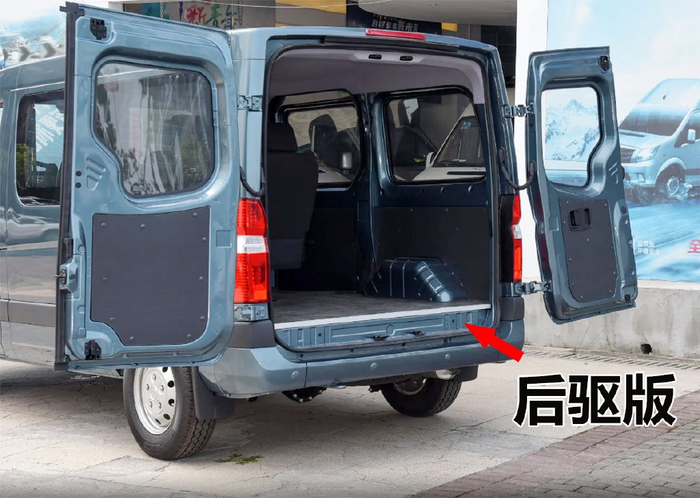 作为一辆轻客车型,其后备箱空间也是一大亮点。另外从后备箱位置也能够明显的看出前驱版地板高度降低之后和后驱版形成了很明显的差别,前驱版地板和后杠上缘是基本平齐的,而后驱版的后备箱地板则是要比后杠上缘高出了一阶。