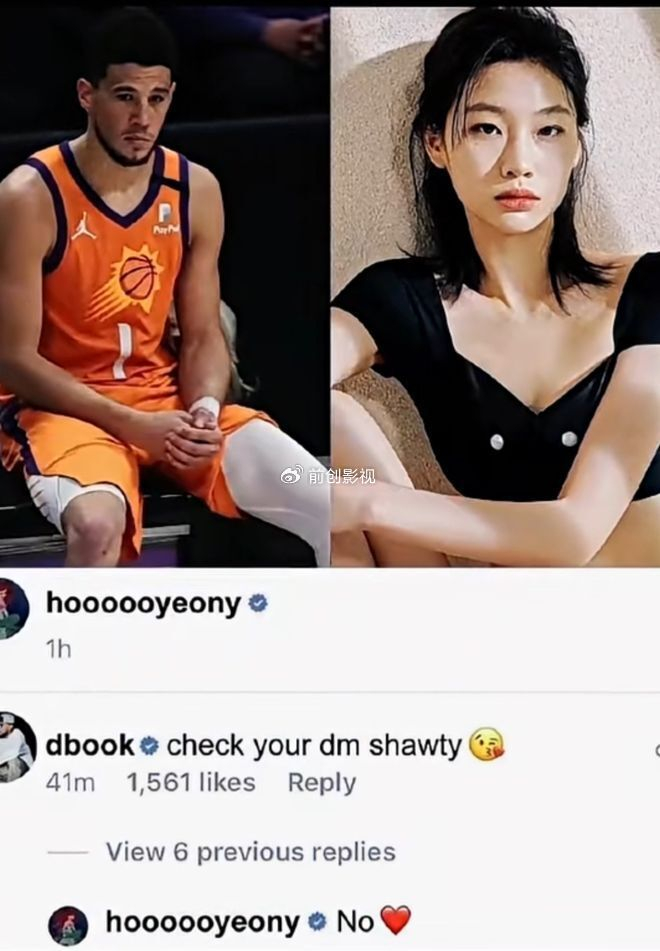 在郑浩妍晒出了自己的照片之后,德文-布克写道:“查收你的私信吧,小可爱”。还发出了一个“飞吻”的表情包。随后,郑浩妍直接拒绝:“不要”。