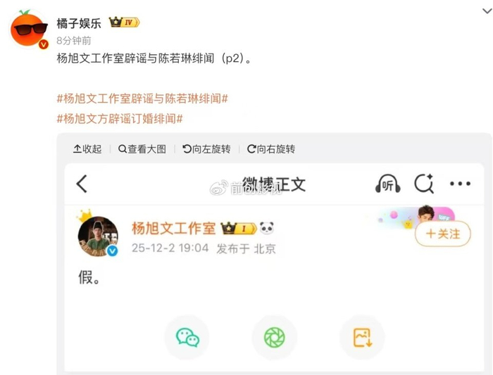今天,杨旭文工作室官方发文回应称:“假。”陈若琳因为没有个人社媒,所以暂未回应。