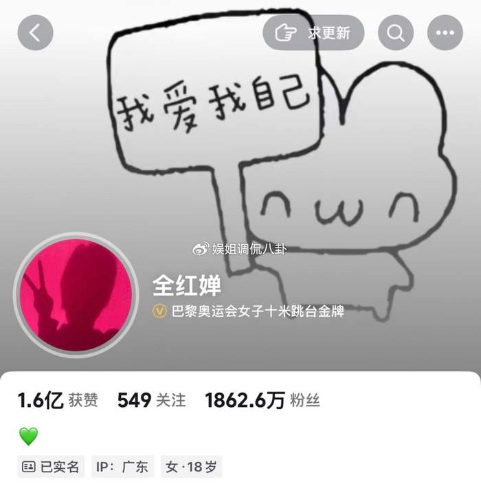 网友还发现,全红婵把社媒账号的背景照片换了,换成了一个卡通形象,举着一个牌子,上面写着“我爱我自己”,整个背景的色调则是灰白色。