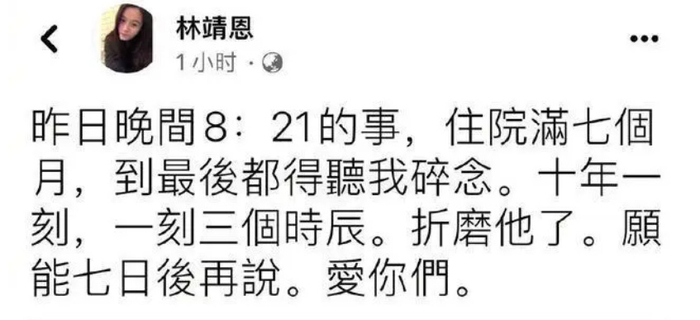 随后,林靖恩则在9日晚上证实死讯。她在文中透露,李坤城是在昨晚8点21分去世的,整整在医院里住了7个月,离世时林靖恩一直陪在他身边和他说话,林靖恩表示李坤城生命最后一刻都在听她在身旁碎碎念,“十年一刻,一刻三个时辰”是林靖恩和李坤城在一起的时间,生病这段时间,李坤城一直饱受折磨,林靖恩非常心疼地写道:“折磨他了,愿能七日后再说,爱你们”。