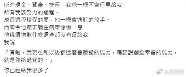 而据李坤城的儿子透露,李坤城将所有的遗产都留给了他的女友林靖恩,或许也是觉得这一生亏欠女友太多,留下巨额遗产,就是希望她往后的日子过得富裕一些。不过,遗产全给女友不给儿子,感觉李坤城有点太过冷血了。所幸的是,李坤城的儿子并没有因此而恼其父亲,并且当时还安慰躺在病床上的李坤城,称自己现在能赚钱了,有创造幸福的能力了,并称就是父亲给他的。