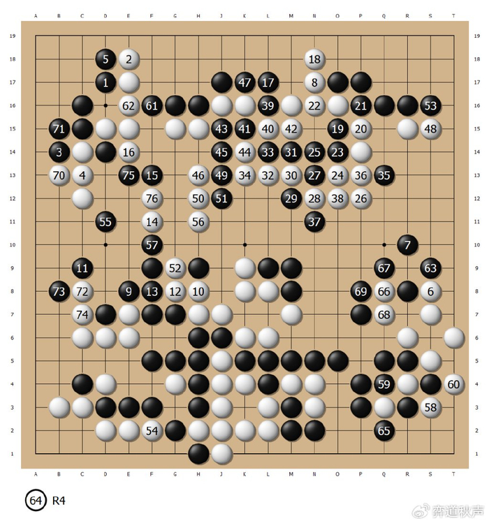 白58、60再抢到右下角大棋,白66、68先手彻底活棋,黑棋总是不行了。