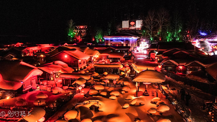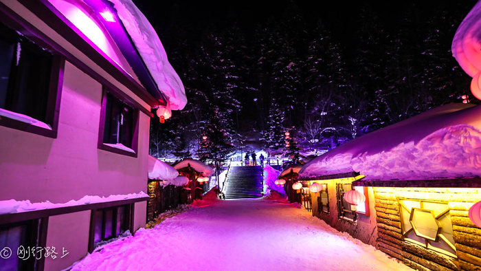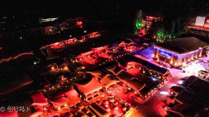 不管从哪个入口登入棒槌山观光栈道,都能欣赏到雪乡的全貌,仿佛走进了“白雪公主与小矮人”的童话世界。夜色下,洁白无瑕的白雪在院中高高挂起的红灯映照下,泛着金红色的光芒,显得格外喜庆,空气中弥漫开来浓厚的年味。
