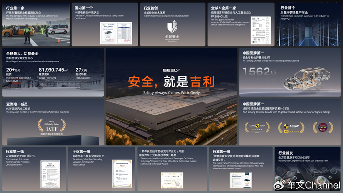 2007 年,吉利正式发布《宁波宣言》,明确将 “安全第一” 确立为企业研发的最高战略,将安全理念融入企业发展血脉,成为企业文化的核心组成部分 —— 吉利也因此成为中国品牌中最早将安全提升至企业战略高度的自主车企之一。