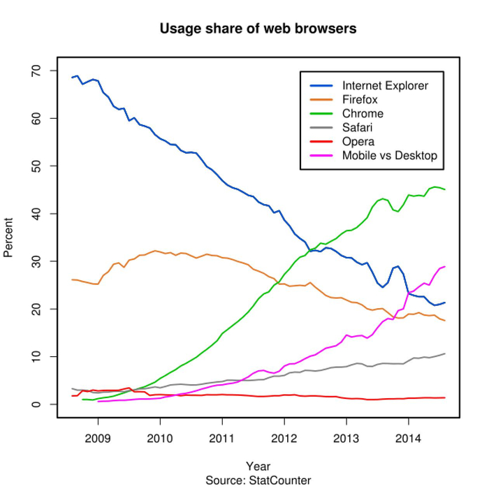 △2009—2014浏览器市场份额走势图久而久之,IE浏览器不再是网友冲浪的首选工具了,但它却成了大家冲浪时津津乐道的段子。