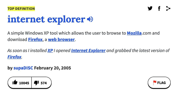 毕竟流行在线字典(Urban Dictionary)都是这么解释的:IE,一个为了下载别的浏览器的小工具。