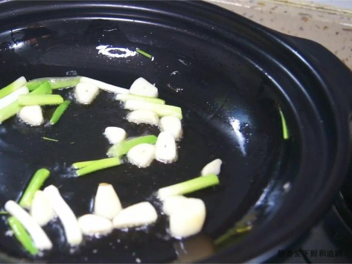 砂锅先爆香蒜片和葱白。