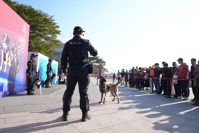 警犬互动区始终人气高涨,搜爆、缉毒等专业警犬的技能展示赢得阵阵掌声,街坊们纷纷与这些忠诚的“无言战友”近距离互动、拍照留念。
