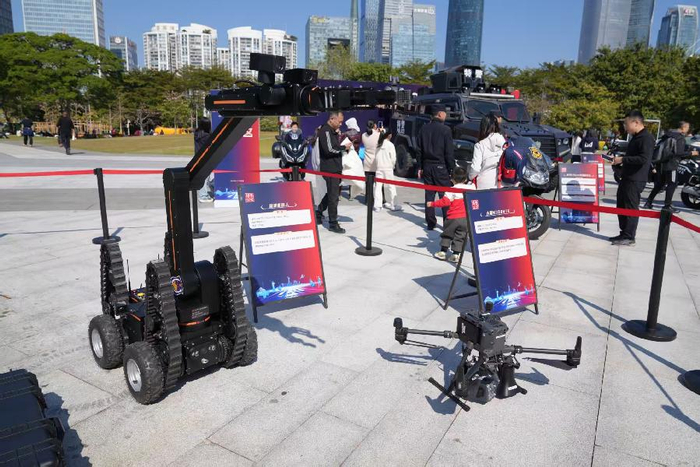 警犬技能展示在装备观摩区,“暴龙”装甲防暴车、智能机器狗、警用升降执勤台及警用救援气垫等装备吸引了众多目光,不少市民主动上前合影。