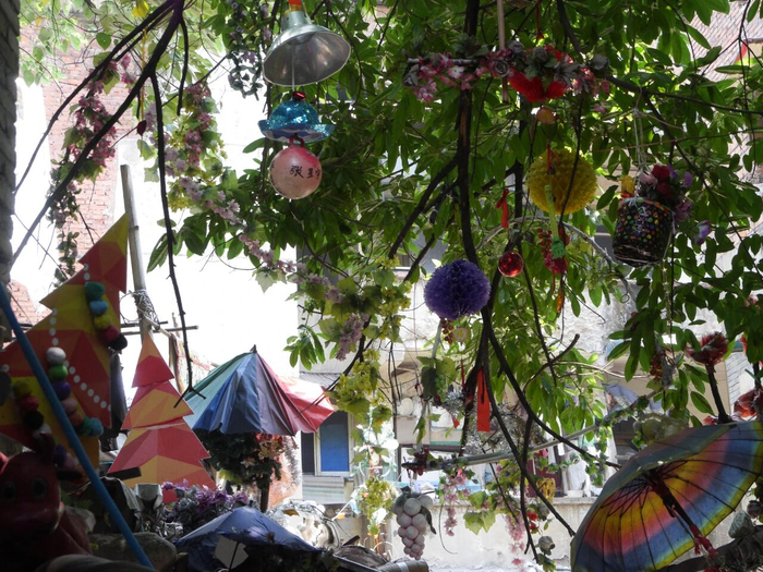 她背着背篓,把人们不要的垃圾一点点带回去——霓虹灯招牌、椅子、木棍、彩色袋子、玩偶、泡沫恐龙蛋、塑料模特、奄奄一息的盆栽……一个个被她按照自己的心意安插在合适的地方。日久天长,这个位于十八梯城中村的旮旯变成了一座奇特的花园。
