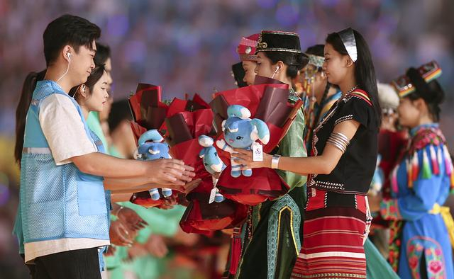2024年11月30日,五十六个民族代表在海南三亚举行的第十二届全国少数民族传统体育运动会闭幕式上为志愿者献花。运动会期间,数千名志愿者“小鹿鹿”奔赴十余个竞赛场馆、二十多家接待酒店、媒体中心、机场车站等地,为来自全国各地的运动员、技术官员、工作人员和观众提供礼宾接待、交通引导、安全保卫等志愿服务。