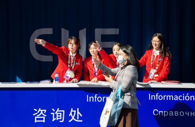 2025年11月10日,第八届中国国际进口博览会闭幕,志愿者为参观者提供咨询服务。第八届进博会共有3865名志愿者“小叶子”,服务于现场引导咨询、展会注册管理、新闻宣传辅助、交易数据统计、医疗卫生辅助等岗位。为提升多语种服务水平,本届进博会志愿者服务保障组首次联合复旦大学、同济大学、上海外国语大学等高校,组建“小语种志愿者联盟”,招募129名志愿者,提供俄语、德语、法语、西班牙语、阿拉伯语、意大利语、葡萄牙语、日语、韩语、泰语等十多个语种服务。