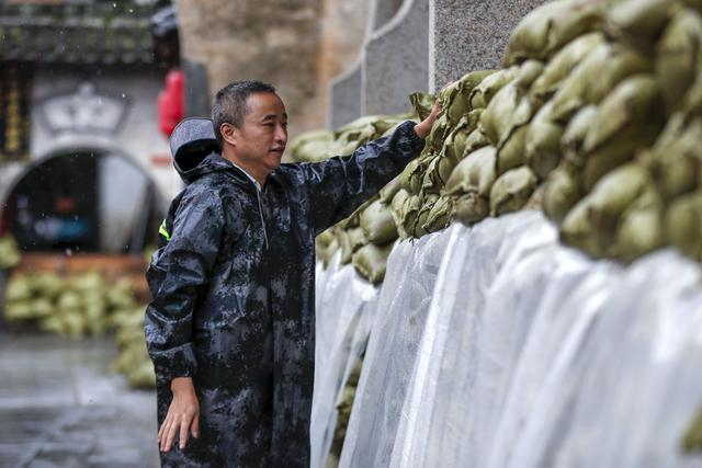2024年6月27日,工作人员在安徽省黄山市徽州区呈坎村加固文物保护单位罗东舒祠前的防汛沙袋。2024年6月19日入梅以来,黄山市遭遇持续性强降雨,造成部分地区道路损毁、蔬菜绝收。洪灾过后,志愿者迅速投身防汛救灾一线,积极与省市县多方专业抢险救援力量配合,以最快速度恢复正常生产生活秩序。