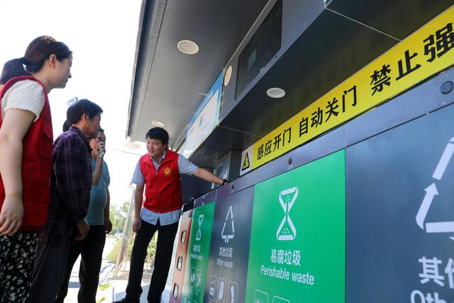 2023年9月1日,志愿者在安徽省合肥市长丰县庄墓镇枣林社区指导居民使用智能垃圾分类回收设备。