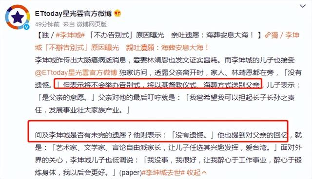 李坤城儿子透露父亲离开时家人和林靖恩都在旁,没有遗憾,并表示不会举办告别式,将以海葬方式送别父亲。