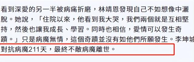 林靖恩没有想象中那么快的接受生离死别,伴侣一直鼓励,她也坚信有奇迹,但是奇迹并没有发生,李坤城对抗病魔211天后离开了。而且,林靖恩不忍心看着经历无数次痛苦的化疗,决定让李坤城冒风险插管开刀延续生命,手术前李坤城都没来得及跟林靖恩说上最后一句话。
