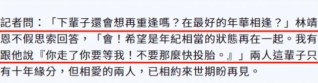林靖恩还坦言如果有下辈子希望在年纪相当的状态下在一起,并不后悔自己的选择,她还喊话亡夫:“你走了,你要等我!不要那么快投胎。”同时,李坤城告诉林靖恩他的遗愿是不举办公祭,丧礼低调处理。