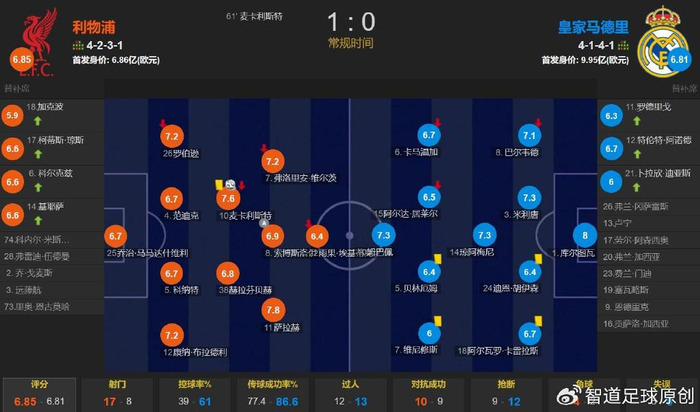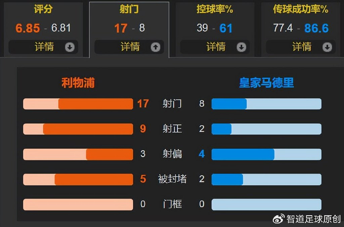 比赛数据进一步说明了此役利物浦碾压皇马,利物浦的控球率仅为39%,但有17次射门,比皇马的2倍还要多1次;射正比更是9-2。利物浦赢球的比赛,全场最高分是皇马门将库尔图瓦(8分),这足以说明此役的比赛局势。皇马进攻端,贝林厄姆和维尼修斯状态非常低迷,姆巴佩独木难支。皇马输给利物浦遭遇欧冠赛季首败,也给阿隆索上了一课。