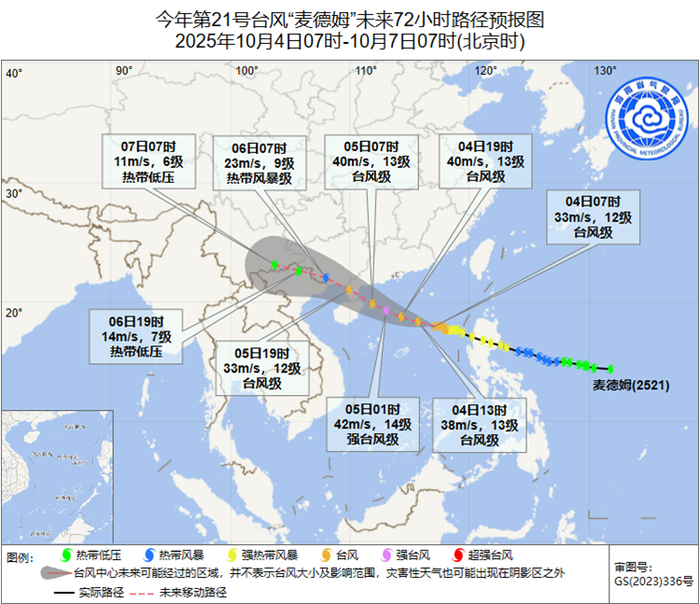 气象台预报表示,今年第21号台风“麦德姆”10月4日02时由强热带风暴级加强为台风级,07时其中心位于北纬18.0度、东经117.1度,也就是在距离海南省文昌市东南方向约660公里的南海东部海面上,中心附近最大风力12级(33米/秒)。
