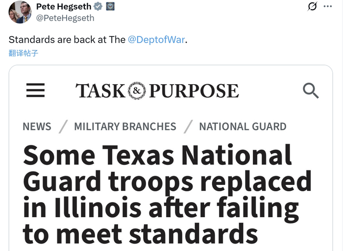 此后,得克萨斯州军事部门的发言人也向美国军事新闻网站“任务与目的”(Task & Purpose)透露,在部署至伊利诺伊州的200名国民警卫队士兵中,“一小部分人”因未达到特定标准已被替换。但该部门拒绝透露涉及的具体部队、人数和原因。