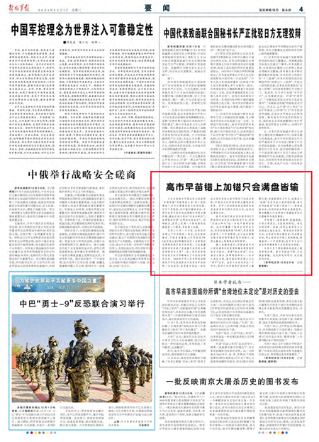12月3日,《解放军报》04版转载评论文章,《高市早苗错上加错只会满盘皆输》,全文如下。