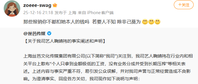 随后,@丝芭传媒 发布“关于我司艺人鞠婧祎的事实阐述和声明”,称鞠婧祎在行业内和相关平台上散布“个人只拿到金额极低的工资,没有业务分成并受到长期压榨”等相关表述,与事实严重不符,并就鞠婧祎待遇和收入分配问题作出说明。