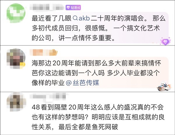 有网友写道:“最近看了几眼AKB48二十周年的演唱会。 那么多初代成员回归,很感慨。 一个搞文化艺术的公司,讲一点情怀多重要。”