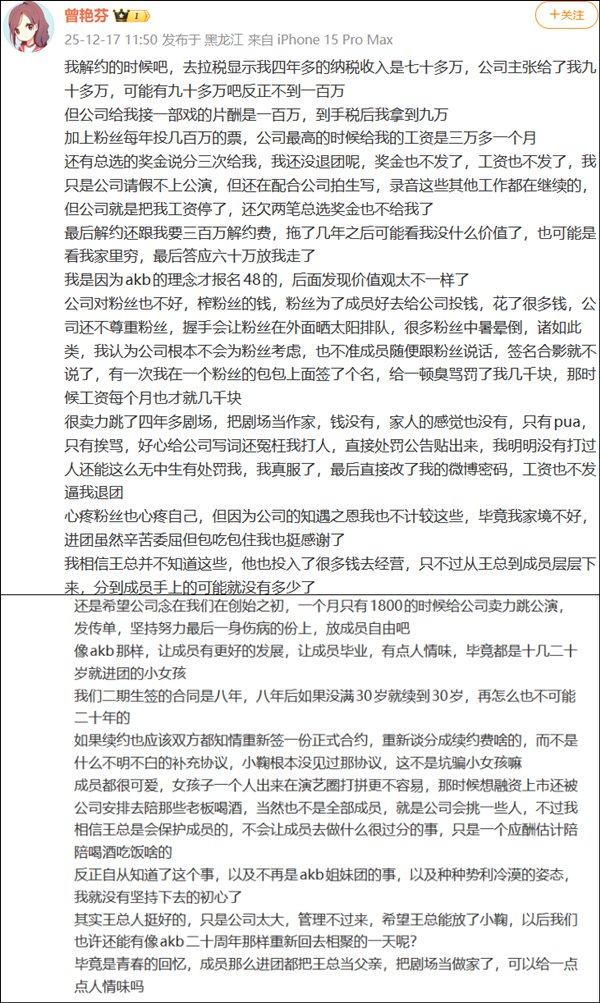“公司给我接一部戏的片酬是一百万,到手税后我拿到九万”,“粉丝每年投几百万的票,公司最高的时候给我的工资是三万多一个月,还有总选的奖金说分三次给我,我还没退团呢,奖金也不发了,工资也不发了”,“最后解约还跟我要三百万解约费,拖了几年之后可能看我没什么价值了,也可能是看我家里穷,最后答应六十万放我走了”,“我相信王总并不知道这些,他也投入了很多钱去经营,只不过从王总到成员层层下来,分到成员手上的可能就没有多少了”……