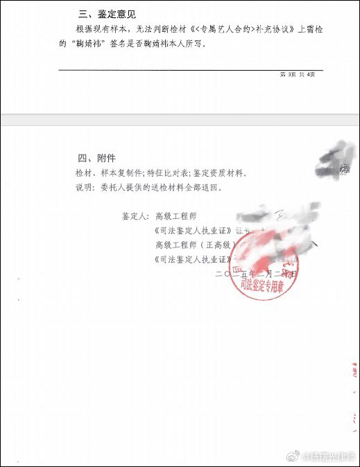 12月16日,上海丝芭文化传媒集团@丝芭传媒 称已经委托具备司法鉴定专业资质的鉴定机构就笔迹进行鉴定,称2018年的《补充协议》是鞠婧祎所签,鞠婧祎应当继续履约。