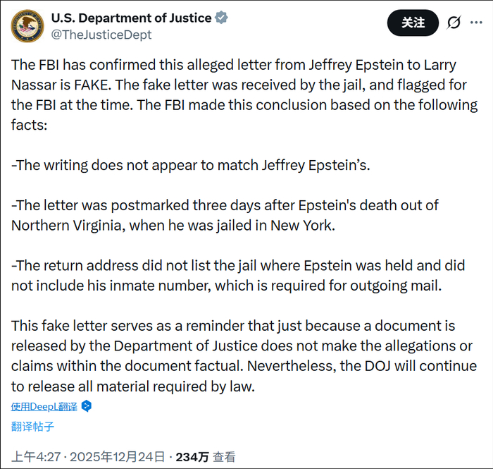 美国司法部在声明中列出了三点原因:首先是调查发现,这封信的笔迹与爱泼斯坦的特征不符;其次,信件的邮戳显示,寄出时间为爱泼斯坦死后三天,且寄出地是北弗吉尼亚州而非关押爱泼斯坦的纽约;回邮地址未标注关押爱泼斯坦的监狱名称及其囚犯编号,后者还是寄出邮件的法定必填项。
