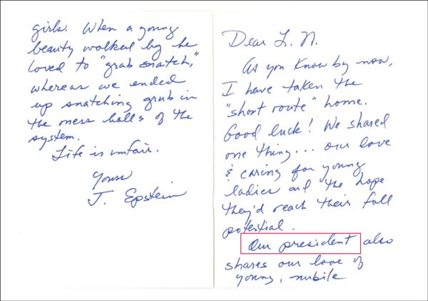 据报道,在这封信中,爱泼斯坦写道:“我们的总统也和我们一样喜欢年轻、性感(nubile)的少女。”爱泼斯坦还写道:“亲爱的L.N.(拉里・纳萨尔缩写):想必你现在已经知道,我已选择‘捷径’回家(指自杀)。祝你好运!我们有一个共同点…… 我们都‘关爱’年轻女性,并希望她们能充分发挥自身潜力。”