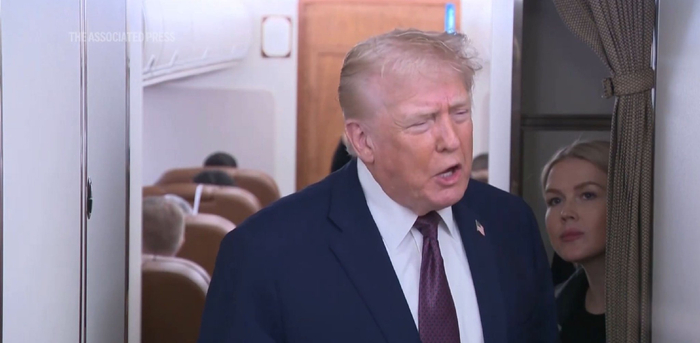特朗普在“空军一号”上回应伊朗相关提问。美联社视频截图《金融时报》报道指出,就在宣布对伊朗贸易伙伴征税的前一天,特朗普曾宣称正考虑对伊朗采取军事行动。他煞有介事道,伊朗对国内抗议示威的处理方式,正逐渐触碰他设定的“动武红线”。