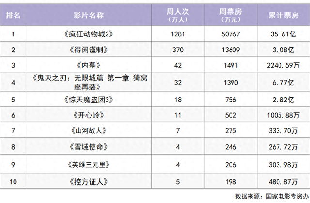 《疯狂动物城2》上周收获票房5.07亿元,蝉联周票房榜冠军,票房约占据周票房七成。凭借上映以来的强势表现,截至目前,影片中国内地累计票房35.61亿元,轻松超越前作《疯狂动物城》15.38亿元的中国内地总票房。