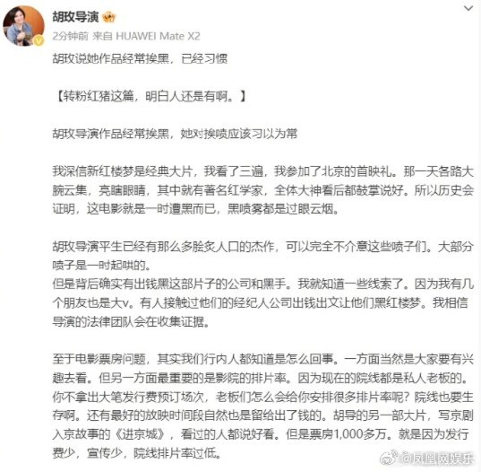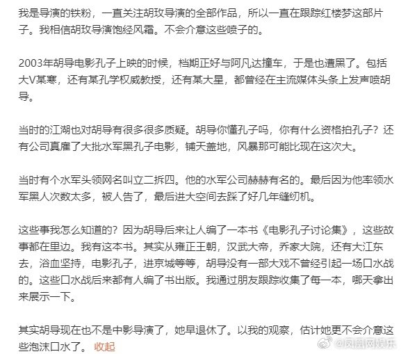 【#胡玫晒力挺电影红楼梦的文章#】#胡玫称明白人还是有啊#8月21日,胡玫导演晒出文章,称:“明白人还是有啊”。该文章力挺《红楼梦之金玉良缘》,作者表示深信新红楼梦是经典大片,北京首映礼各路大腕看后都称好,“历史会证明,这电影只是一时遭黑而已,黑喷雾都是过眼云烟”。又称背后有出钱黑这部片子的公司和黑手,导演的法律团队会在收集证据。他还表示电影是因发行费有限导致的票房低,“我听到周边好多朋友说想看,可是找不到地方买票”。他还回忆了胡玫《孔子》上映时遭黑,水军头领被告入狱的故事。最后,他说胡导“不会介意这些泡沫口水”。