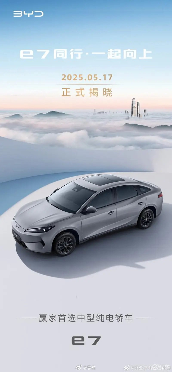 #新车速递#【比亚迪e7(配置|询价)将于5月17日上市 定位全新中型纯电轿车】比亚迪e7采用最新的家族设计语言,轴距2820mm,定位一款中型纯电轿车。新车车头的设计十分简洁,没有过多花哨的元素,封闭式的前脸搭配长条形的头灯,前包围的两侧拥有挖空设计,前脸呈现出向前俯冲的姿态,动感十足。动力方面,新车电机功率100千瓦,单电机,采用弗迪电池,最高车速150km/h。