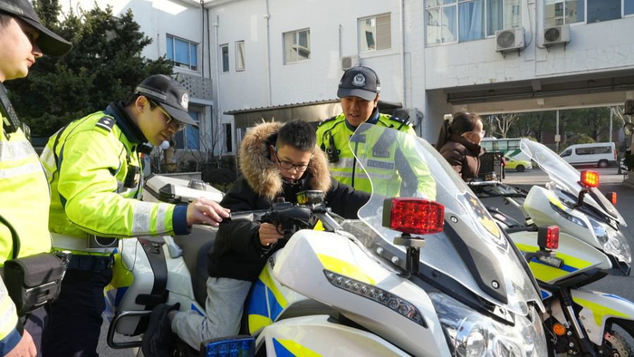 在警用摩托车试乘区,锃亮的警用摩托车一字排开,民警为孩子们讲解了摩托车的性能、安全装备及执勤用途,并挑选符合条件的青少年佩戴好安全头盔,体验了短暂的低速骑行。坐在驾驶座上的孩子们眼神坚定,仿佛瞬间变身“小交警”,亲身感受了执勤民警的工作场景。