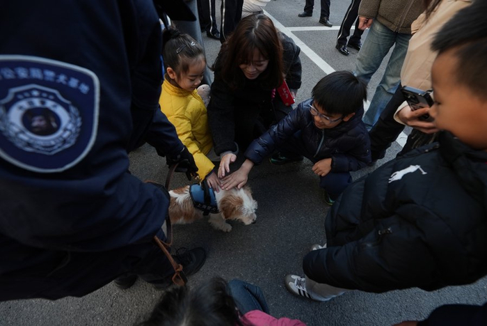 警犬互动区则充满了温情与欢乐。训练有素的警犬在训导员的指令下,动作敏捷、反应迅速,赢得了孩子们的阵阵掌声。展示结束后,孩子们在民警的引导下,小心翼翼地抚摸警犬,近距离感受警犬的温顺与忠诚。