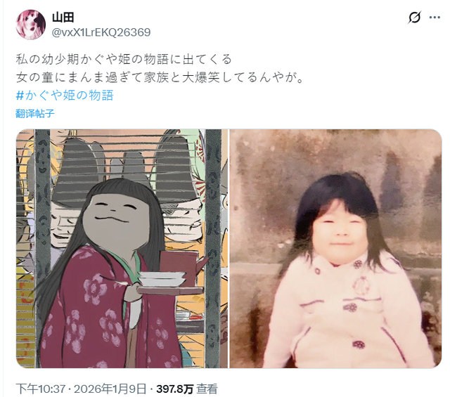 山田本人发文也很直白:“我小时候的样子,和《辉夜姬物语》里的女童一模一样,全家看到直接笑疯。”
