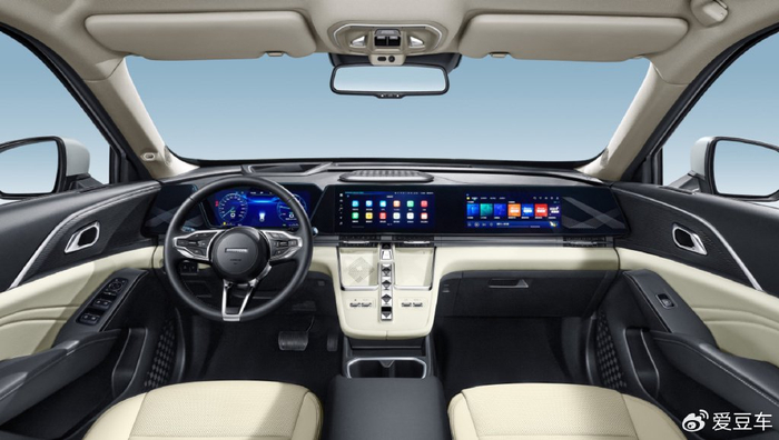 枭龙MAX采用三连屏设计,大小一样都是12.3英寸,其中副驾驶屏幕专攻娱乐,可以独立连接蓝牙耳机。内饰看起来豪华感更强,配置也更丰富,而其配备全新一代Coffee OS系统,搭载骁龙8155芯片,实力挺强。