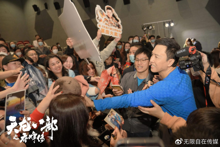 当天影城的映后见面会上,三位主创的出现也使现场观众热情直接燃到顶点。不少观众都在观影后表示甄子丹在影片中的打斗戏份非常精彩,监制王晶也大赞甄子丹就是他心目中的乔峰,“乔峰这个角色的演员很难找的,因为他一定要很能打,也要很能演。”更有小孩子在现场发问甄子丹:“打得这么好看,电影有没有续集?”甄子丹现场调侃:“那就要问老板啦。”引得现场欢乐不断,监制王晶和总出品人朱玮杰也大方回应观众期待“会继续合作,希望有续集。”