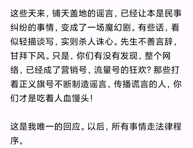 而最后一节,充分表明了小乐要重拳出击的决心,她说网上疯传的这些消息,全都是谣言,也是魔幻剧,还说自己的老公不善言辞,只能甘拜下风。