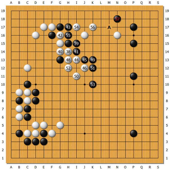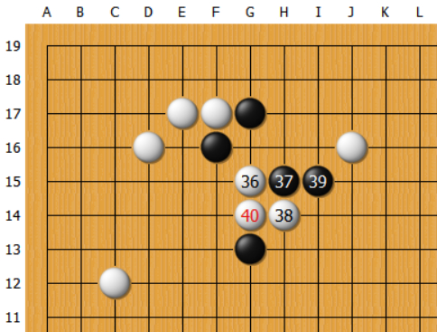 果然,白棋凛冽的攻击来了——白36跨断!如上图所示。我不知道怎么想的,在39步还退让了!