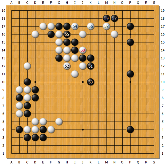 反观白棋,机警果断,走在58位,护住棋形,见上图。黑59仍然迟缓地爬了一手,被白棋在60位断开,左边的六子危险了!