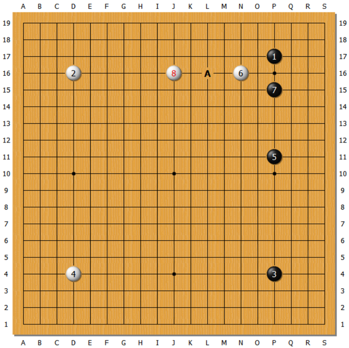 见上图,我以当年非常流行,陈祖德大师开创的“高中国流”开局,白方以二连星应对。可马上白6和8两步“拆三”就遭到王老批评。他说,不好,留下A位打入是讨厌的。