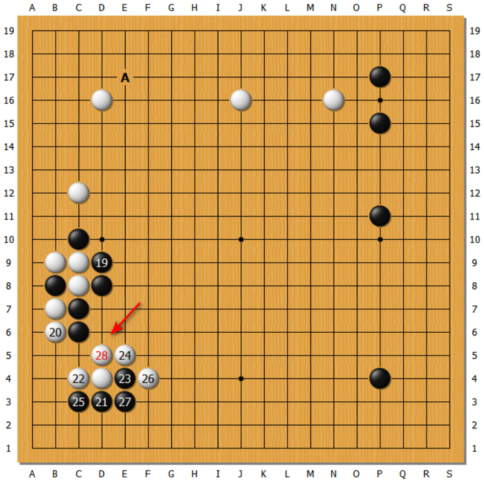 他认为28应该脱先,走在A位小尖,加强黑角。他说,这手缓了,致使白方在此落后手,让黑19一子的损失得到补偿。