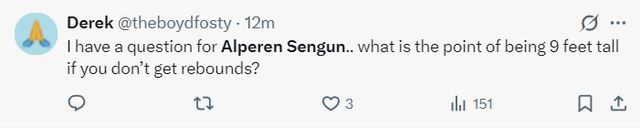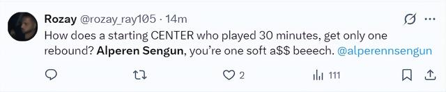 北京时间1月24日,火箭以111-104复仇活塞。这场比赛火箭队的先发中锋阿尔佩伦-申京延续了他对阵费城的低迷状态,此役他的拉胯更盛,火箭球迷们对他已经忍无可忍在社媒上各种炮轰,全都是因为申京作为一名6尺11(2.11米)的中锋只有1个篮板。