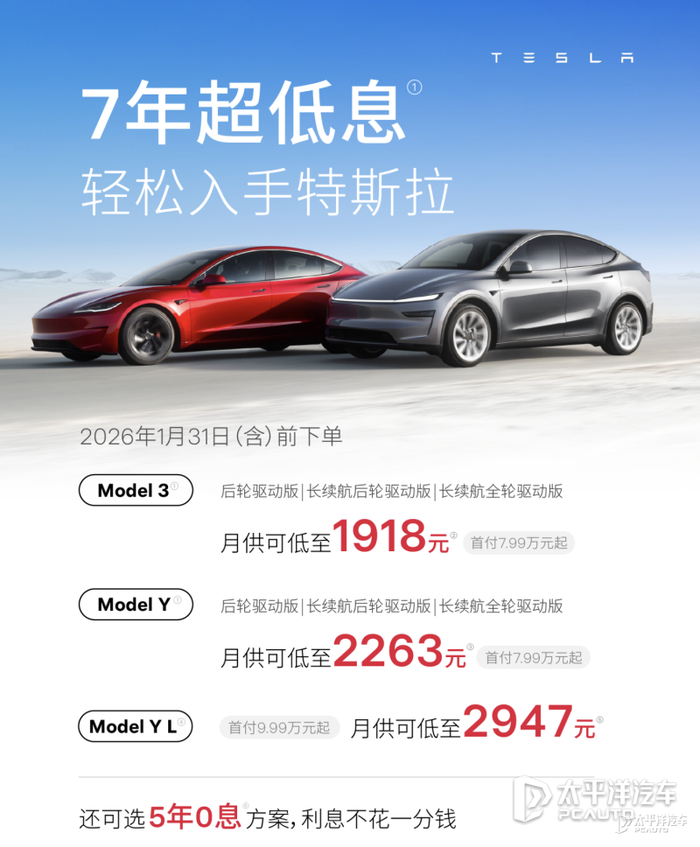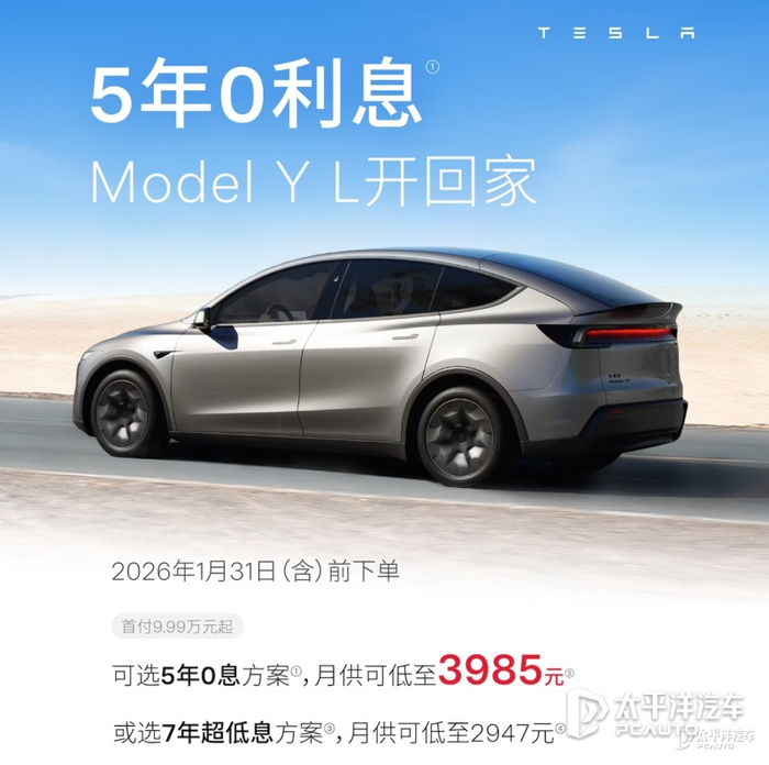 【太平洋汽车 新车频道】 1月6日,从特斯拉官方获悉,特斯拉针对旗下Model 3(配置|询价)、Model Y(配置|询价)、Model Y 三款车型推出7年低息购车方案,其中Model 3/Y首付7.99万起,月供低至分别为1918元和2263元;Model Y L(配置|询价)首付9.99万起,月供可低至2947元,不知道月薪3000-5000元的朋友们是否心动了?同时,特斯拉Model Y L首次推出5年0息购车方案,首付9.99万元,月供低至3985元。