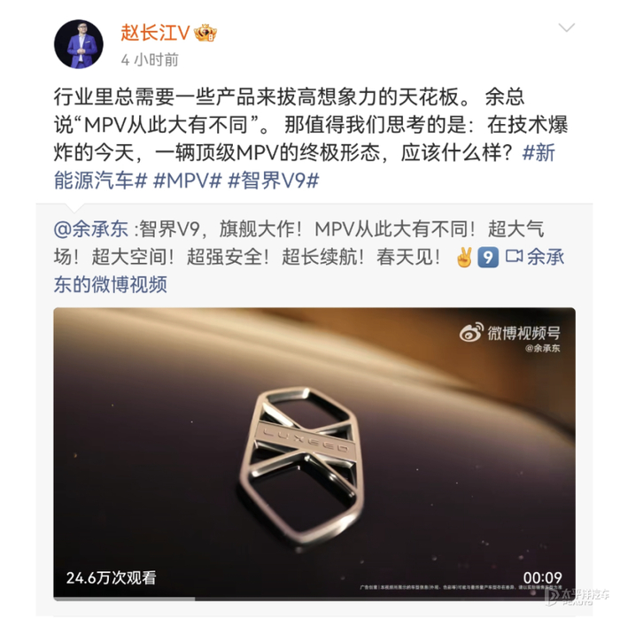 【太平洋汽车 新车频道】1月9日,华为常务董事、产品投资评审委员会主任、终端BG董事长余承东在社交平台发文表示:智界V9,旗舰大作,MPV从此大有不同,具备超强气场、超大空间、超强安全、超长续航等亮点。赵长江更是夸赞智界V9保守估计三年内没有对手。