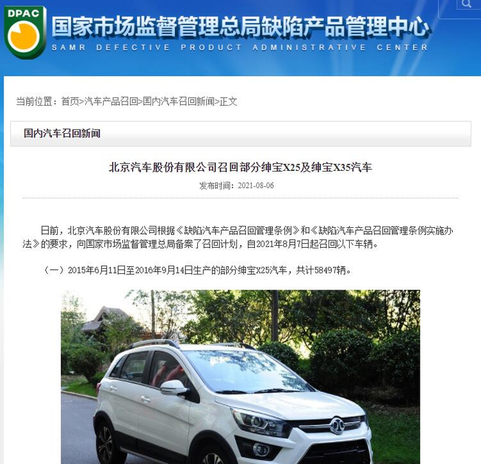 回到之前的话题,北汽绅宝已退市近两年,却又传来将被大量召回的消息。近日,国家市场监督总局发布消息,北京汽车股份有限公司向市场监督管理总局备案了召回绅宝X25、绅宝X35总计超16万辆的召回计划,并于2021年8月7日起正式召回。